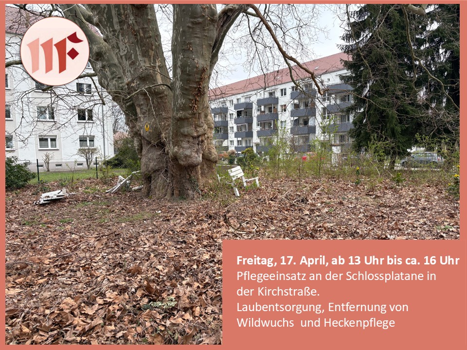 Der Museumsverein plant einen Pflegeeinsatz an der historischen Schlossplatane in der Kirchstraße. Freitag, 17. April, ab 13 Uhr bis ca. 16 Uhr Laubentsorgung, Entfernung von Wildwuchs und Heckenpflege Was wird