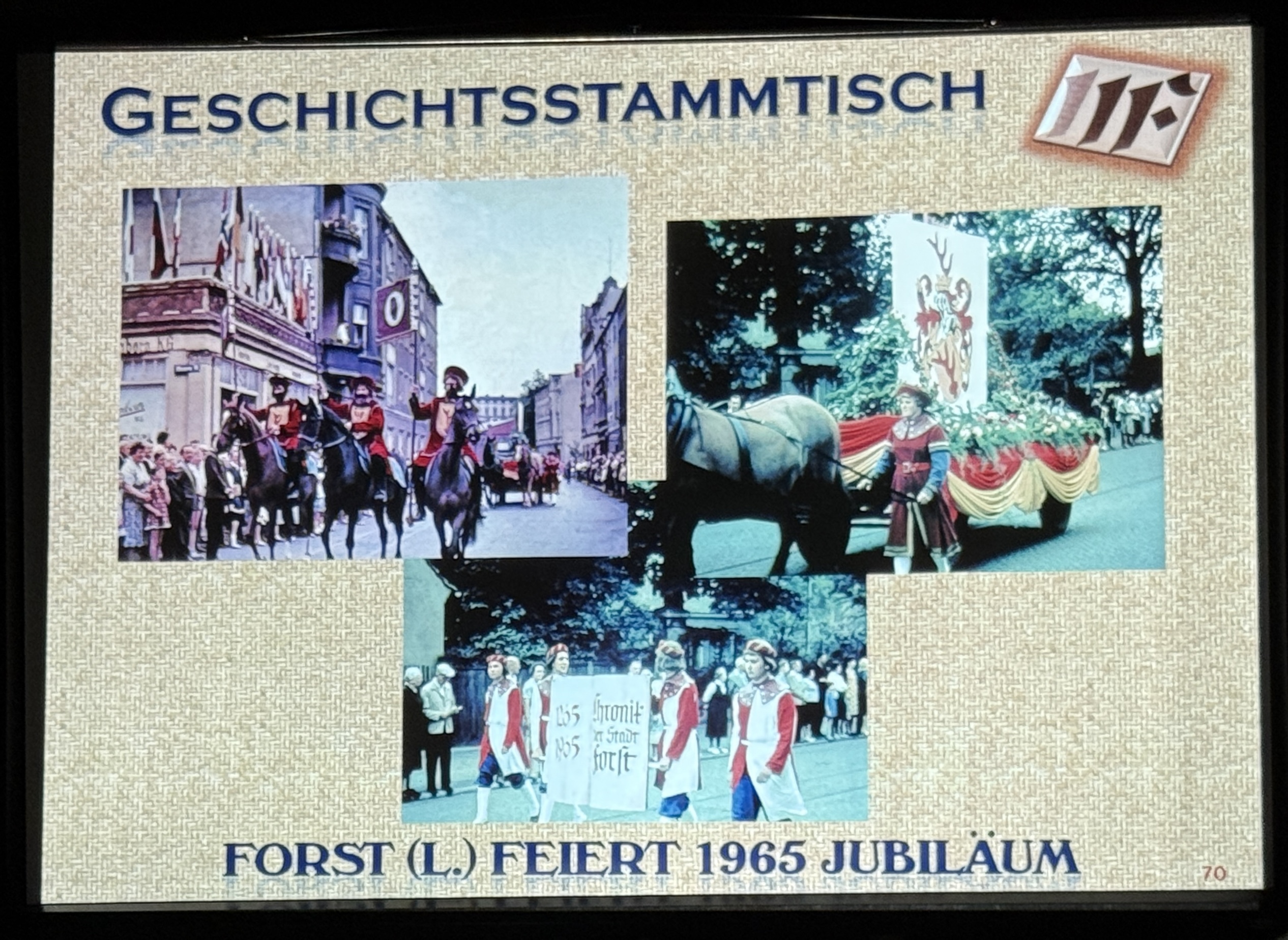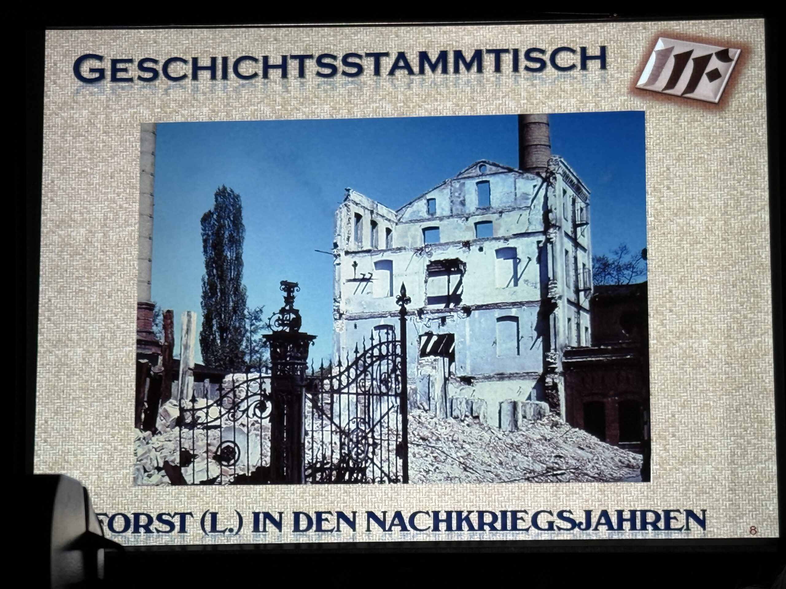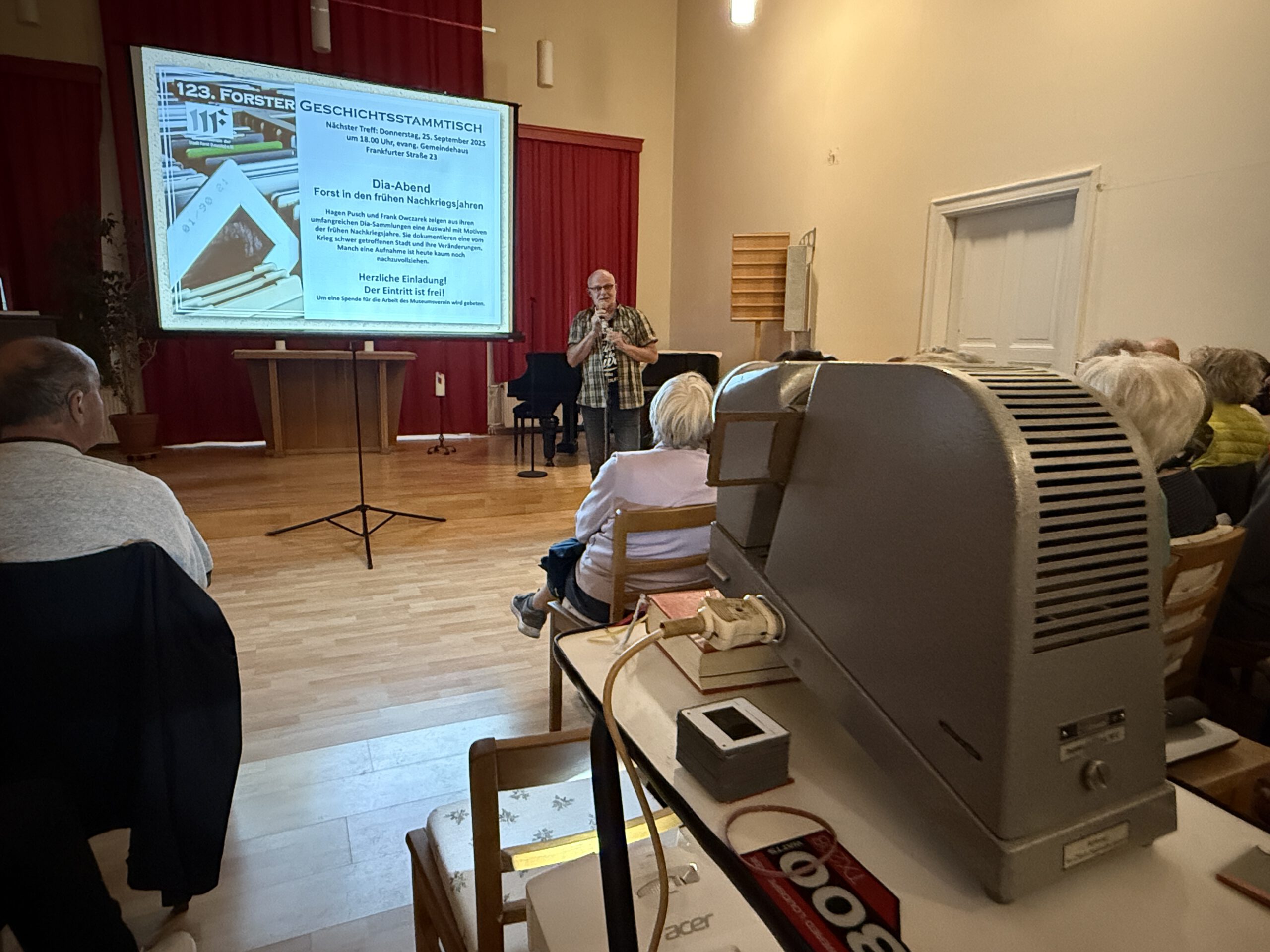 Wieder einen sehr gelungenen Geschichtsstammtisch präsentierte am 25. September der Forster Museumsverein. Unter dem Titel „Dia-Abend“ gaben Hagen Pusch und Frank Owczarek Einblicke in die Nachkriegszeit in der Stadt. Von der großen Zerstörung des 2. Weltkrieges und den schweren Wiederaufbau-Jahren bis zu neuem Mut und Leben in den 1950er und 1960er Jahren. Den Einstieg brachte der originale Diaprojektor von Erich Fabian, welcher noch immer seinen Dienst tat!