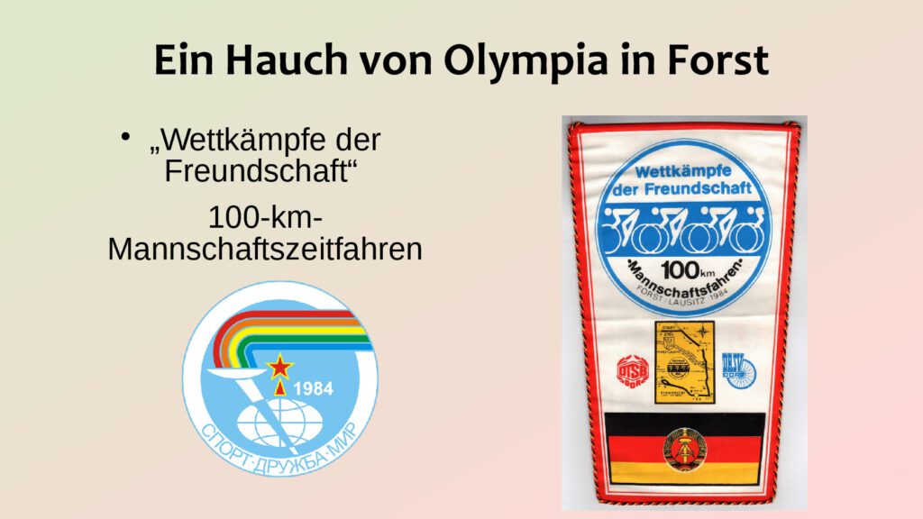 Mit ein paar Filmschnippeln präsentierte Thoralf Hass den über 100 Besuchern die wohl publikumsstärksten Sportveranstaltungen wie das große Sportfest in den 1930er Jahren und das 100-km-Mannschaftszeitfahren 1984, das als Olympia-Ersatz für die vom „Ostblock“ boykottierten Olympischen Spiele in Los Angeles ausgetragen wurden. 40 000 Zuschauer sollen die Rennstrecke zwischen Forst und Eichwege gesäumt haben.