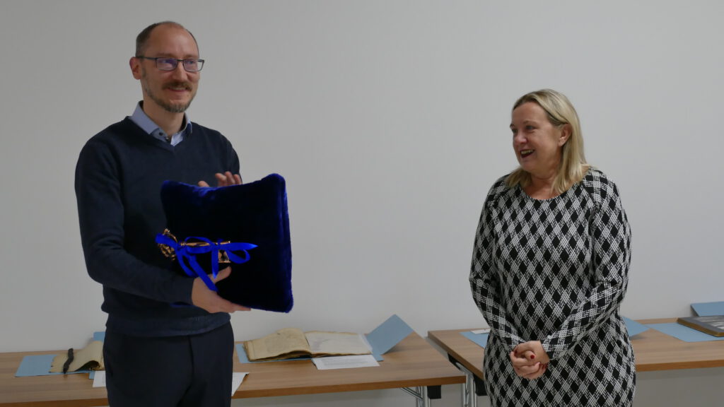 Am Dienstag, den 25. November 2025, fand in Anwesenheit der Bürgermeisterin Simone Taubenek, der Forster Rosenkönigin Stefanie III., Stadtverordneter mehrerer Parteien, der Verwaltungsvorstände Heike Korittke, Jens Handreck und Sven Zuber, dem ehemaligen Stadtarchivar Dr. Jan Klußmann und weiterer Gäste die offizielle Eröffnung des neuen Standortes des Forster Stadtarchivs in der Cottbuser Straße 29 E statt. Bürgermeisterin Simone Taubenek übergab nach ihrem Grußwort dem Leiter des Stadtarchivs, Martin Knopp, symbolisch den Schlüssel.