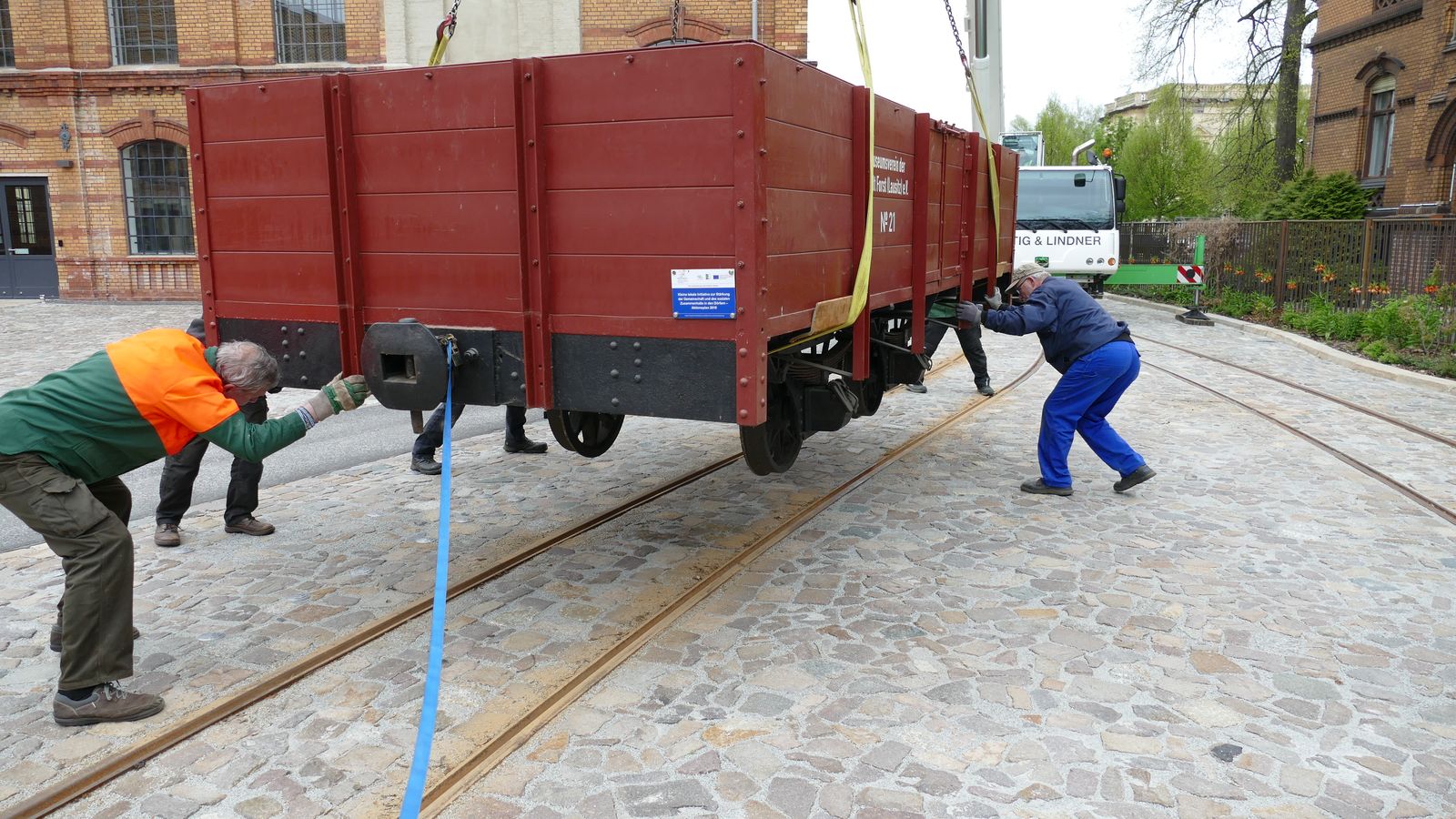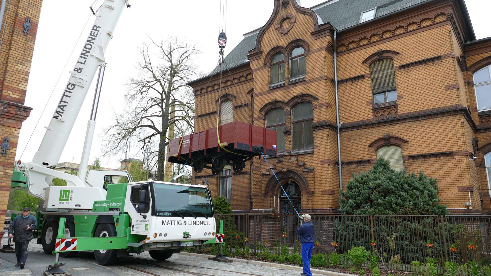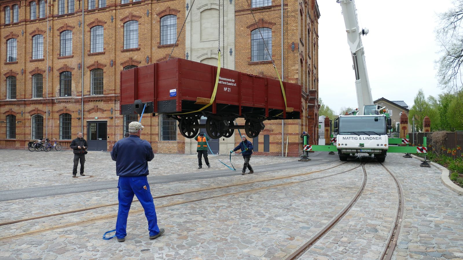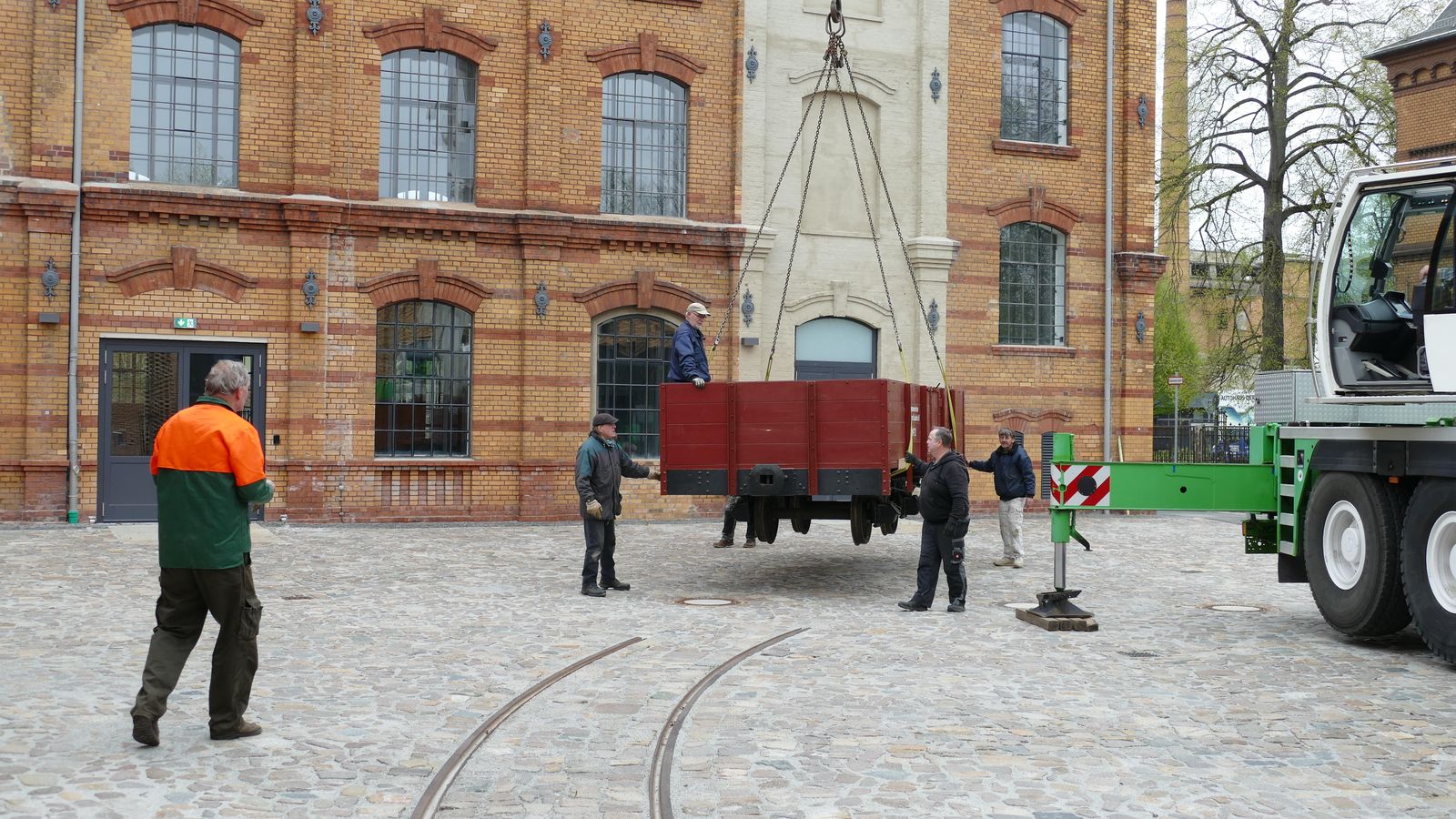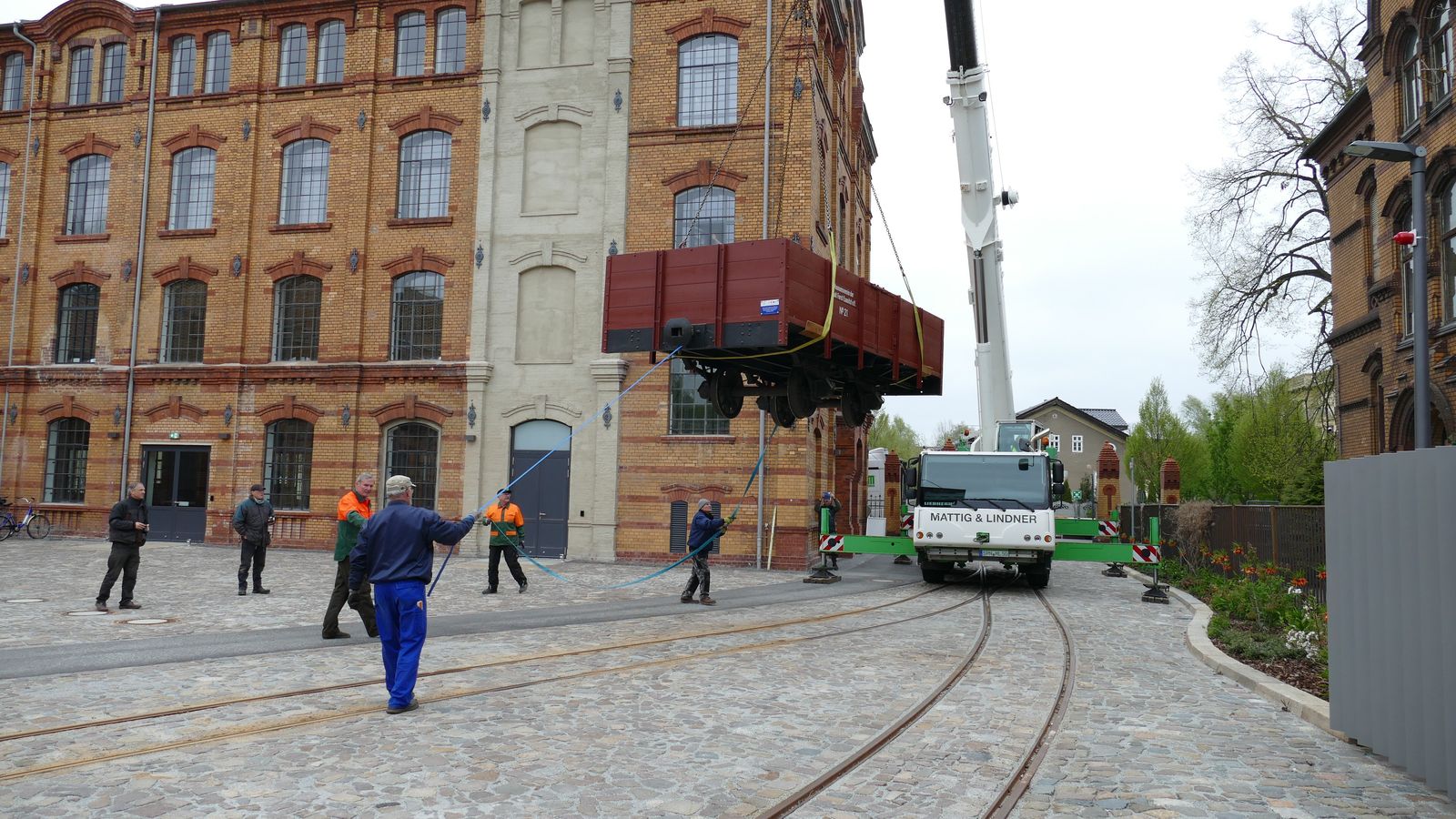 Ein Schwerlastkran der Fa. Mattig & Lindner hob den Meterspurwagen auf einen Tieflader, wo er in 200 Meter Luftlinie auf dem Hof des Industriemuseums wieder abgeladen wurde und seinen endgültigen Stellplatz erhielt.