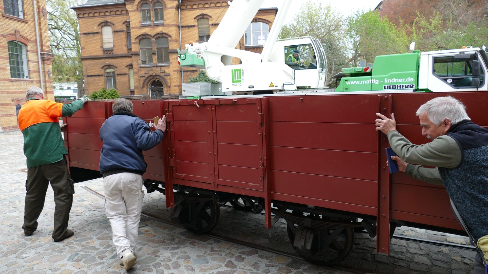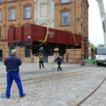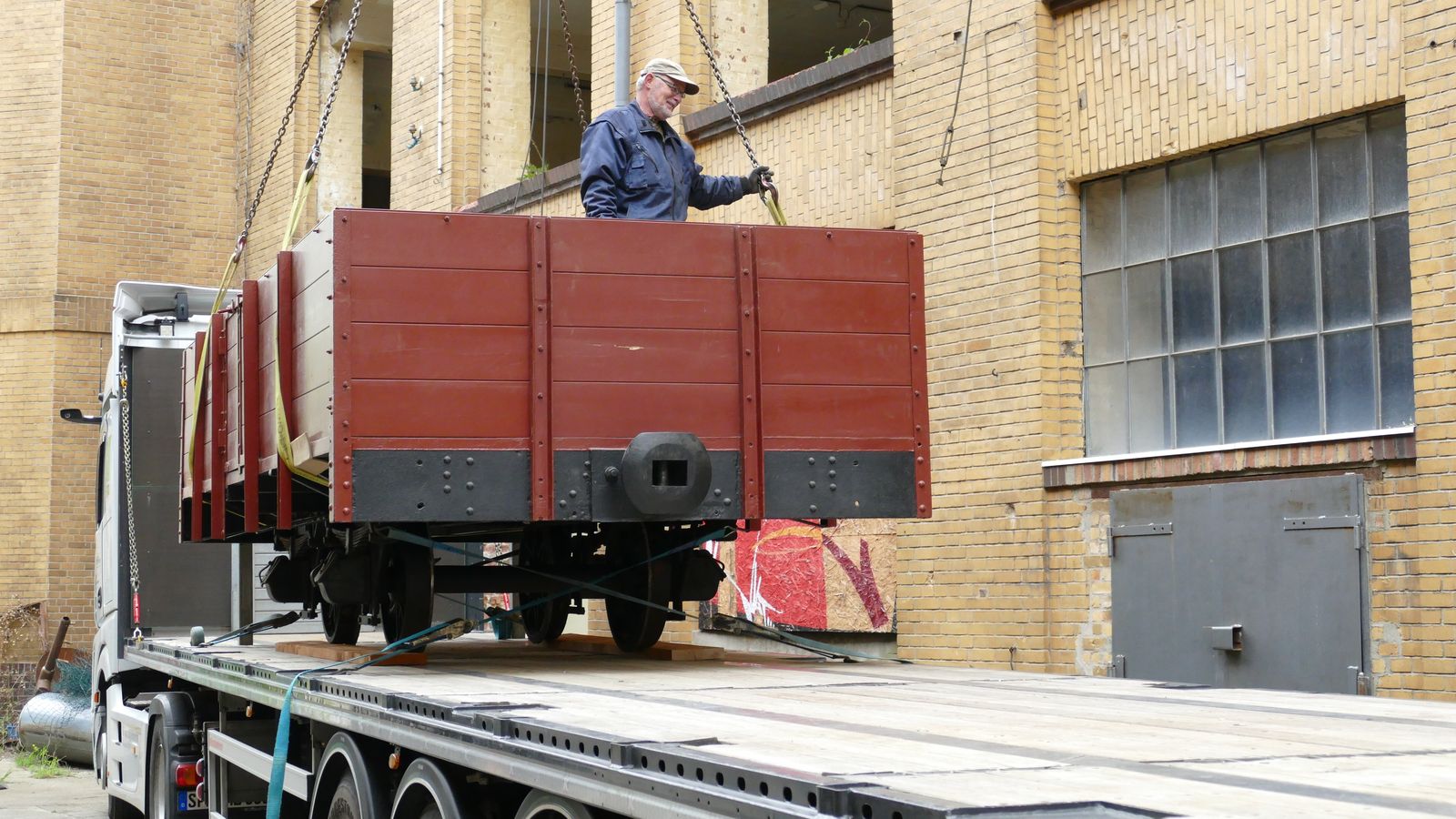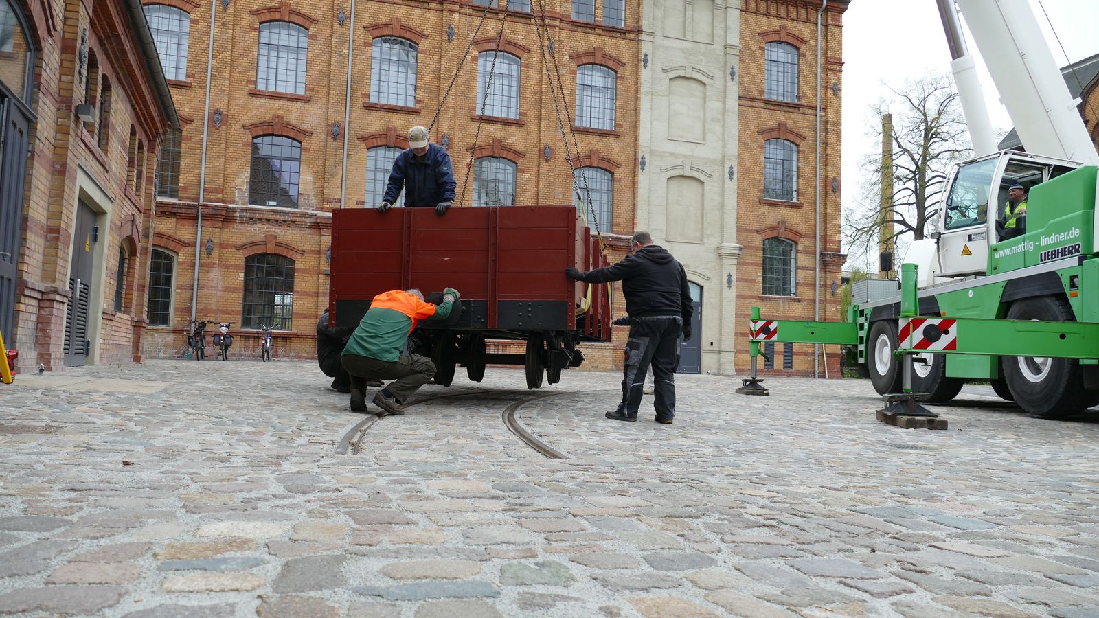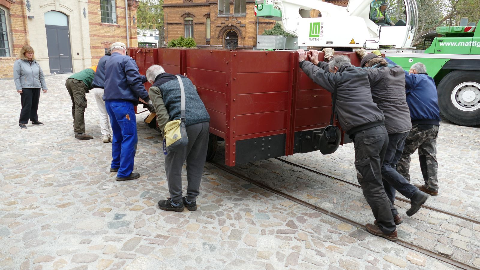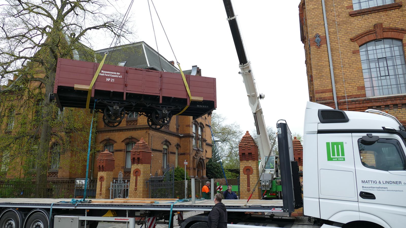 Ein Schwerlastkran der Fa. Mattig & Lindner hob den Meterspurwagen auf einen Tieflader, wo er in 200 Meter Luftlinie auf dem Hof des Industriemuseums wieder abgeladen wurde und seinen endgültigen Stellplatz erhielt.