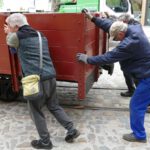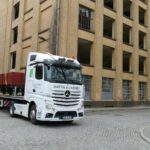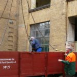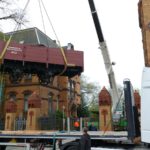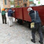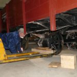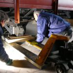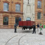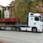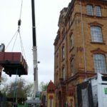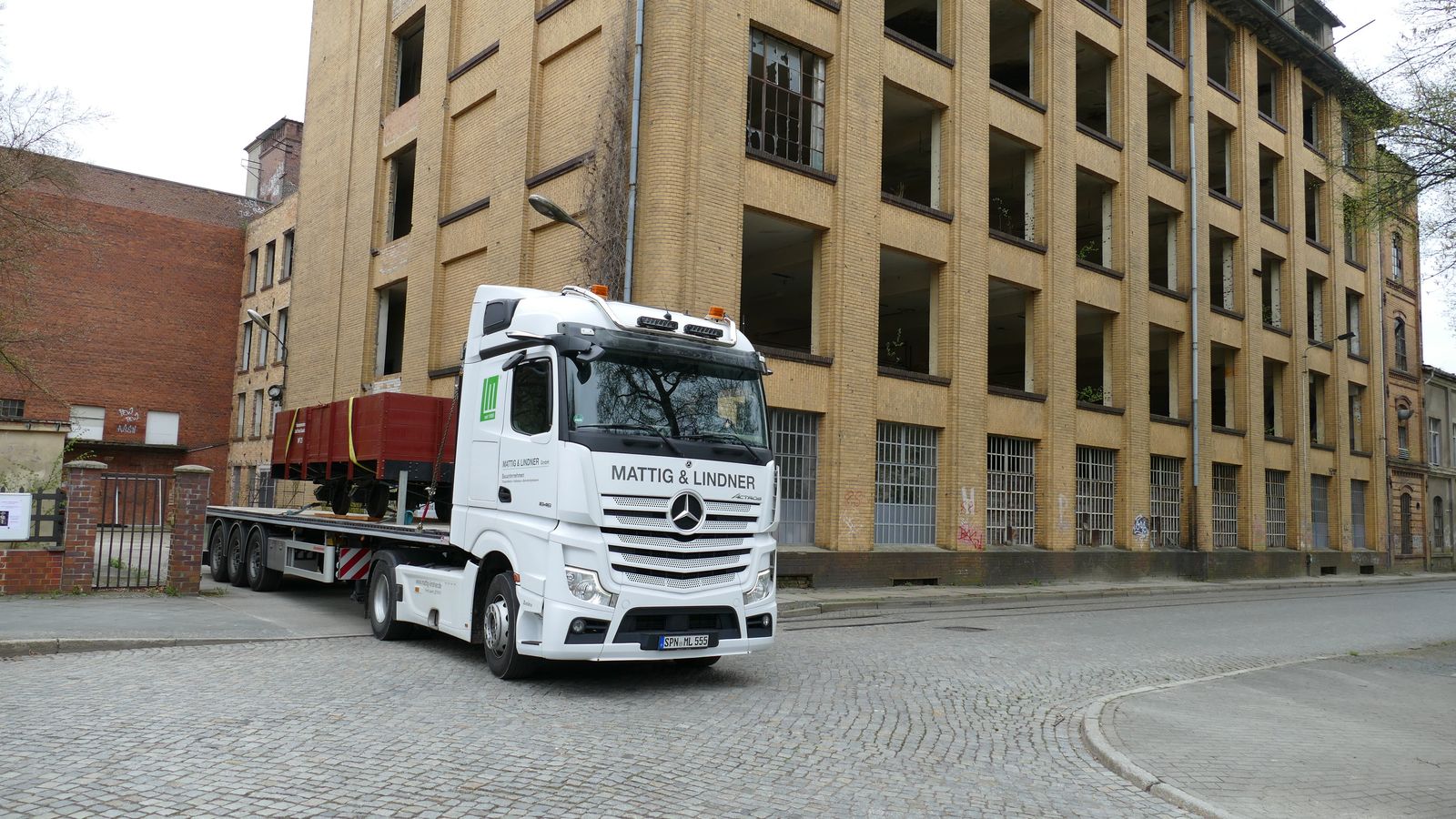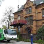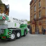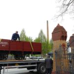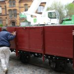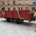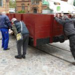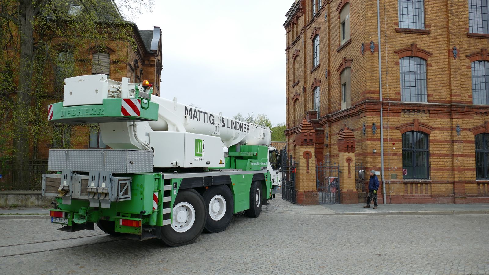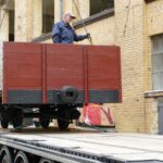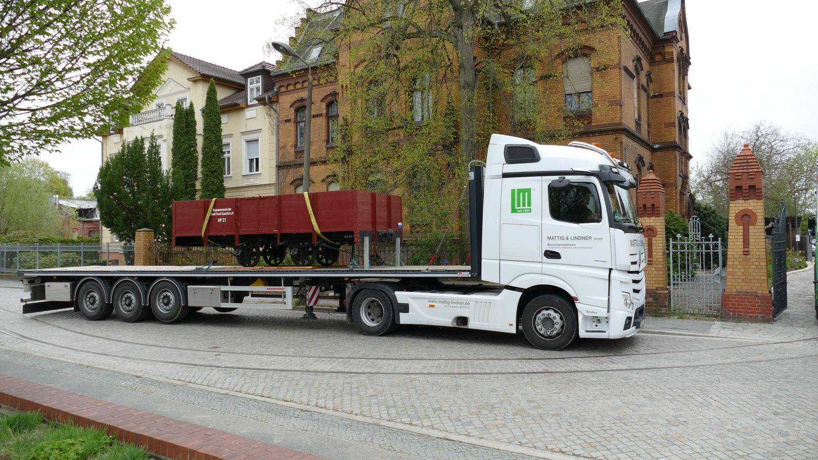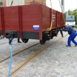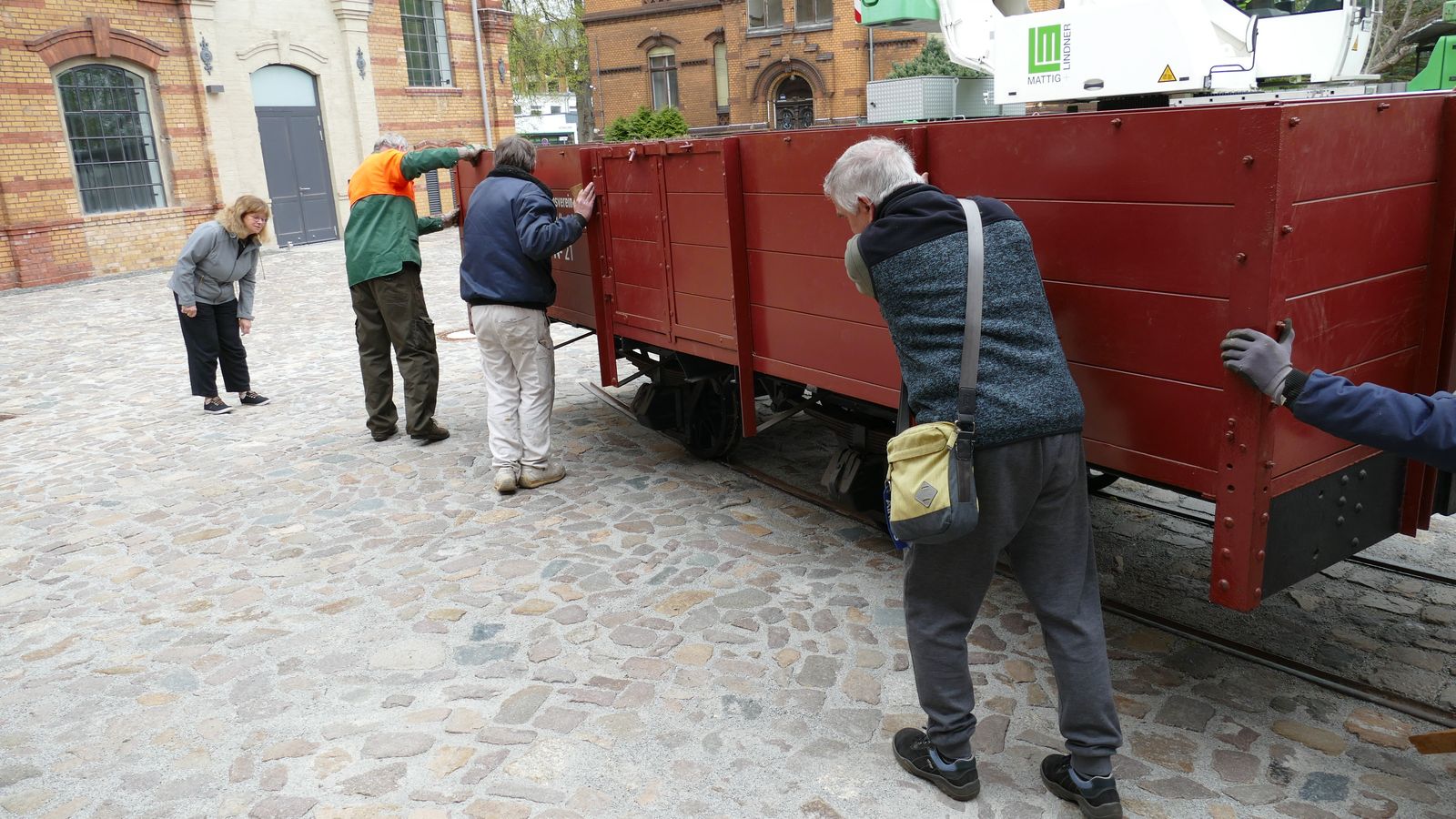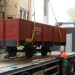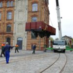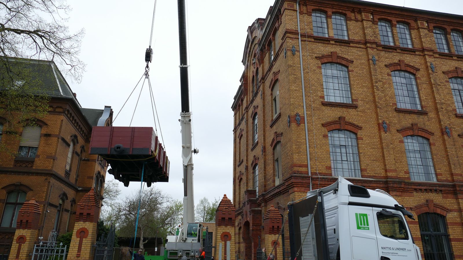 Ein Schwerlastkran der Fa. Mattig & Lindner hob den Meterspurwagen auf einen Tieflader, wo er in 200 Meter Luftlinie auf dem Hof des Industriemuseums wieder abgeladen wurde und seinen endgültigen Stellplatz erhielt.