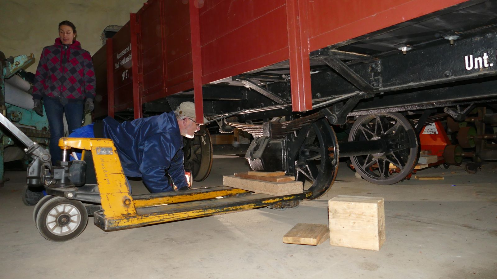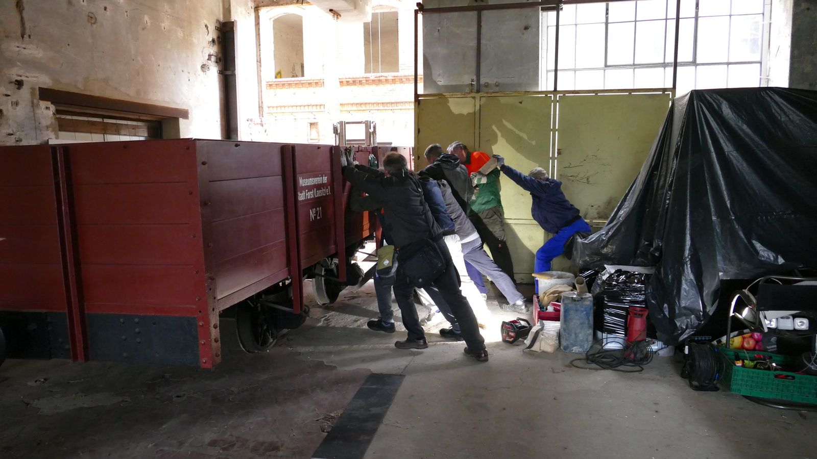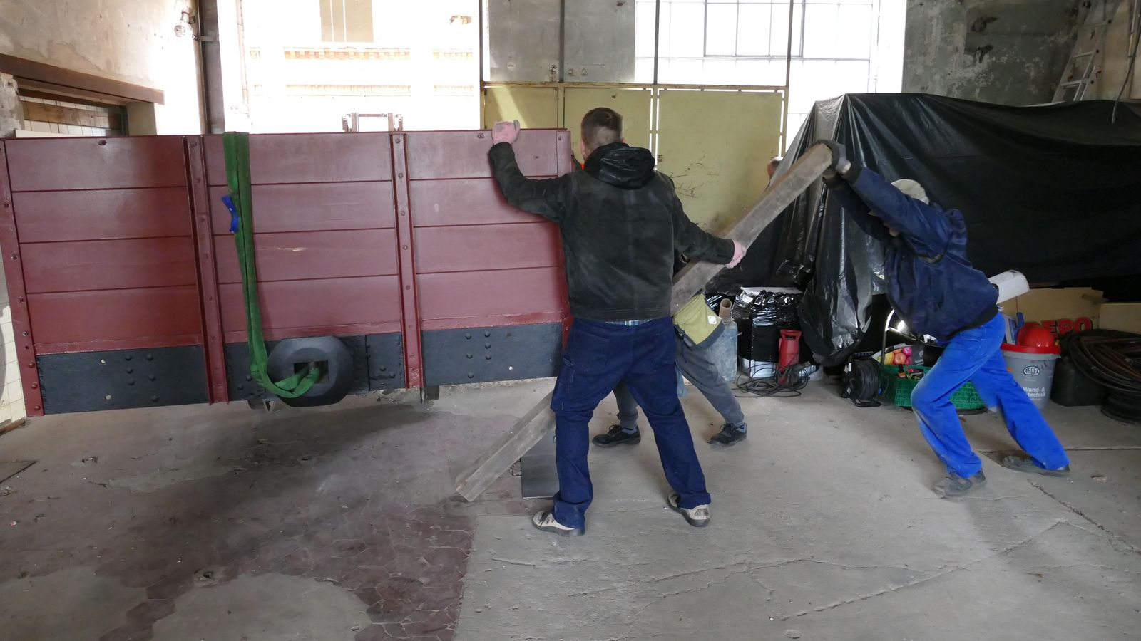 Kein leichtes Unterfangen, denn um den Wagen zunächst ins Freie zu bekommen, mußte der Wagen mittels Hubwagen und Gabelstapler angehoben und etwas in Richtung Ausgang geschoben werden. Der gut 4 Tonnen schwere Güterwaggon wurde danach um 90° gedreht und weiter per Muskelkraft ins Freie bugsiert. Nur wenige Zentimeter Platz war zwischen dem Waggon und dem Torrahmen der Einfahrt zur Lagerhalle.