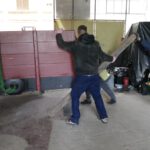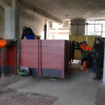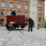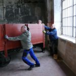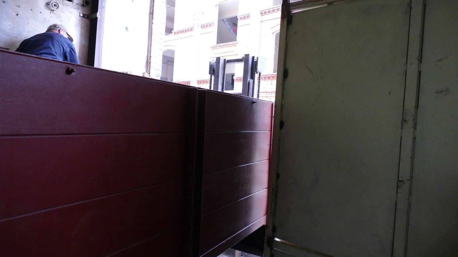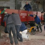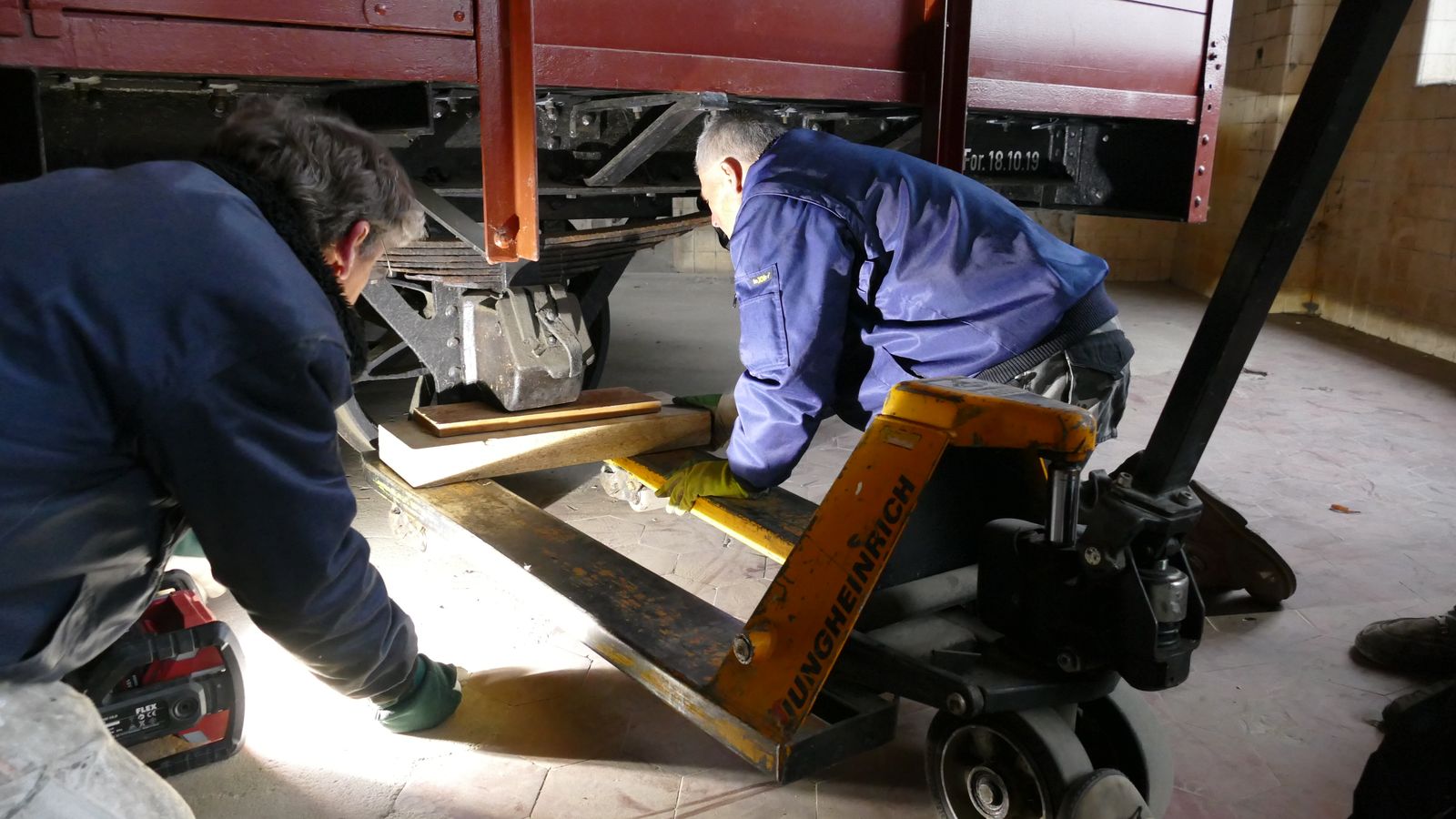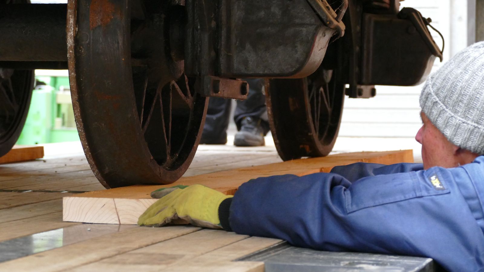 Kein leichtes Unterfangen, denn um den Wagen zunächst ins Freie zu bekommen, mußte der Wagen mittels Hubwagen und Gabelstapler angehoben und etwas in Richtung Ausgang geschoben werden. Der gut 4 Tonnen schwere Güterwaggon wurde danach um 90° gedreht und weiter per Muskelkraft ins Freie bugsiert. Nur wenige Zentimeter Platz war zwischen dem Waggon und dem Torrahmen der Einfahrt zur Lagerhalle.